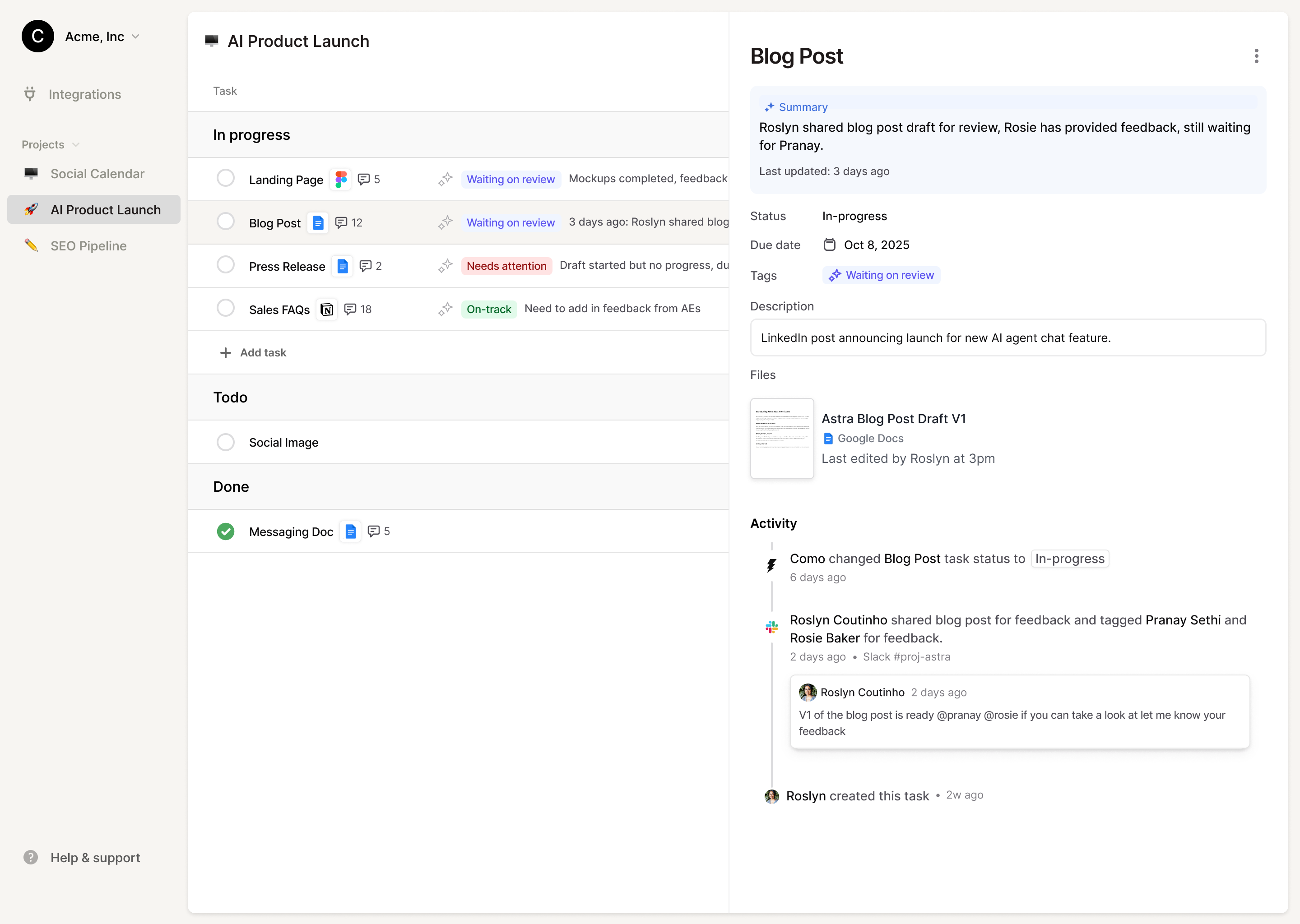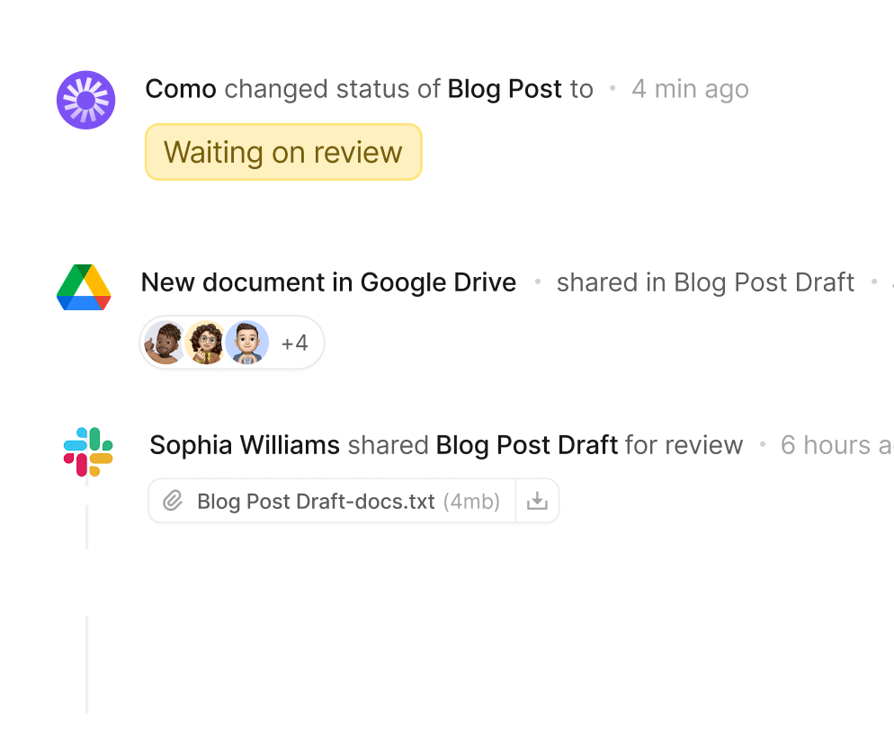 Maestro captures files, messages, links, and feedback as they happen—tying them to the right task automatically. The result: an activity log that’s always up-to-date, so you can see exactly what’s going on without chasing people.